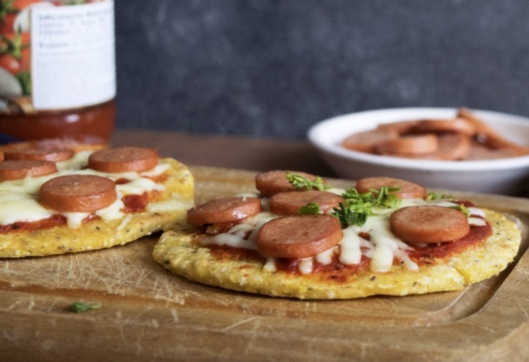 Asa el Arepazo Fit con Semillas por un par de minutos en sartén. Encima le pones la salsa de tomate escogida. Ralla un poco de Queso Doble crema del Artesano y le pones encima a la arepa con la salsa. Encima, pones las rebanadas de salchicha. Ponle una tapa a la sartén y espera a que se derrita el queso. O pon la preparación en el horno por 5 minutos a 180 grados.