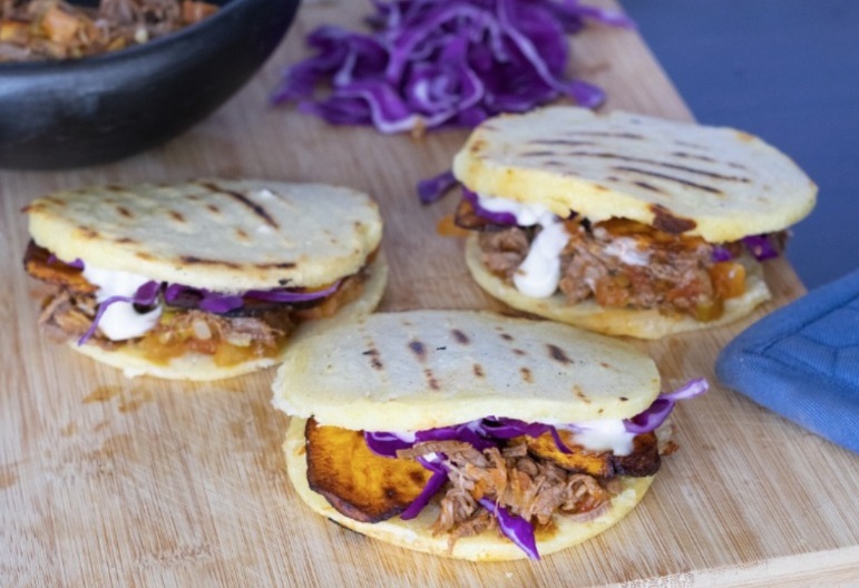 Hamburguesa de arepa con carne desmechada